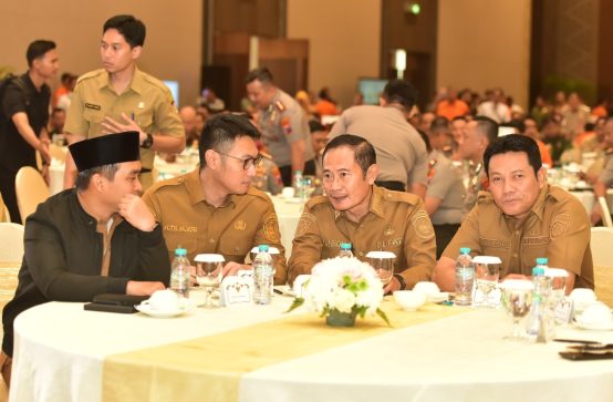 Bupati Lamongan Yuhronur Efendi dan kepala daerah di Jawa Timur tampak hadir dalam Rapat Koordinasi Penanganan Dampak Hidrometeorologi dan Potensi Bencana Musim Kemarau Jawa Timur Tahun 2026 yang digelar di Dyandra Convention Center, Selasa (7/4) tersebut.