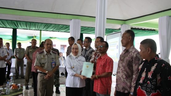 Bertermpat di Pendopo Balai Desa Kedaton, Kecamatan Kapas, Bupati Bojonegoro, Anna Mu’awanah didampingi Forkopimda dan Kepala ATR/BPN Kab. Bojonegoro, turut menyerahkan sertifikat tanah milik warga. Bukan hanya itu. Bupati Anna juga menyaksikan langsung pemasangan patok tanah milik warga, Jumat (3/2).