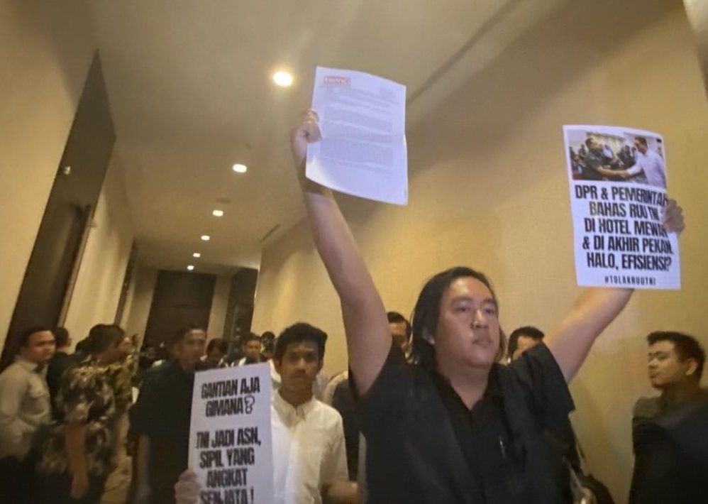 Di tengah sorotan publik terhadap revisi Undang-undang TNI, Pemerintah dan DPR justru memilih membahas RUU ini secara tertutup di hotel mewah pada akhir pekan. Karena aksi pemerintah dan DPR yang tidak peka kondisi, puluhan aktivis menggeruduknya di lokasi hotel bintang 5 tersebut.