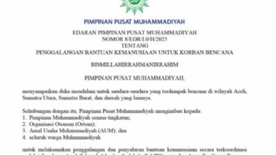 INDOSatu.co – JAKARTA – Bencana alam di berbagai wilayah di daratan Sumatera, seperti di Aceh, Sumatera Barat, Sumatera Utara dan wilayah lainnya membuat Pimpinan Pusat (PP) Muhammadiyah bergerak cepat. Menyikapi bencana tersebut, PP Muhammadiyah mengeluarkan edaran resmi bernomor 8/EDR/I.0/H/2025.