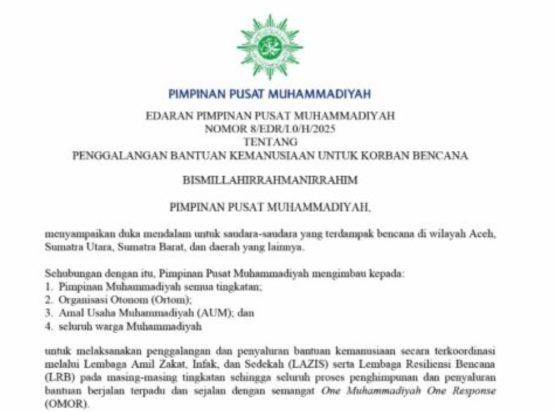 Dalam edaran tersebut, Ketua PP Muhammadiyah, dr Agus Taufiqurrahman menyampaikan duka mendalam dari PP Muhammadiyah atas musibah yang melanda berbagai daerah di Sumatera.