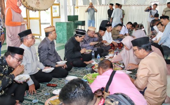 TIDAK BERJARAK: Wakil Ketua MPR RI, Fadel Muhammad (tengah, baju hitam) menikmati hidangan kupat saat bersilaturrahim dengan tokoh masyarakat dan jamaah saat menghadiri acara Doa Kupatan di Masjid Al Muttaqin Yosonegoro, Kecamatan Limboto Barat, Kabupaten Gorontalo, Provinsi Gorontalo, Sabtu (29/4).