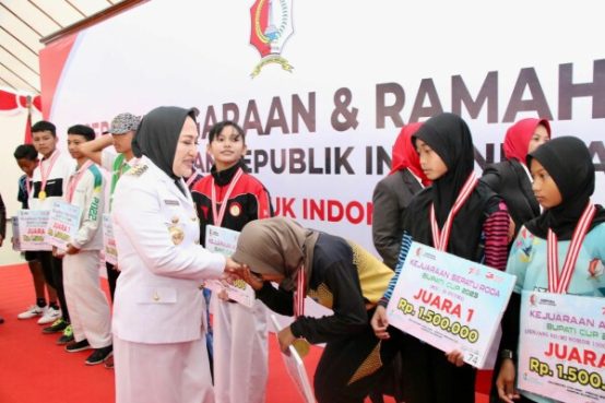 “Untuk hadiah yang kita anggarkan pada kegiatan ini telah diberikan secara tunai kepada pemenang. Kemudian hadiah tambahan dari Ibu Bupati rencananya pada 5 September 2023 akan disalurkan ke rekening masing-masing. Tiap penerima akan diberitahu ketika sudah disalurkan melalui cabang olahraganya,” jelasnya.