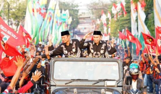 INDOSatu.co – LAMONGAN – Pasangan cabup dan cawabup Lamongan, Yuhronur Efendi-Dirham Akbar Aksara resmi mendaftarkan diri ke KPUK setempat. Pendaftaran paslon Yuhronur dan Dirham menjadi menarik karena diantar mantan Bupati Lamongan, Masfuk, beserta ribuan pendukung Yuhronur-Dirham.