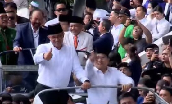 “Yang mau perubahan bilang AMIN, AMIN!,” seru massa pendukung menyambut kedatangan keduanya di Kompleks Kantor KPU Jakarta.