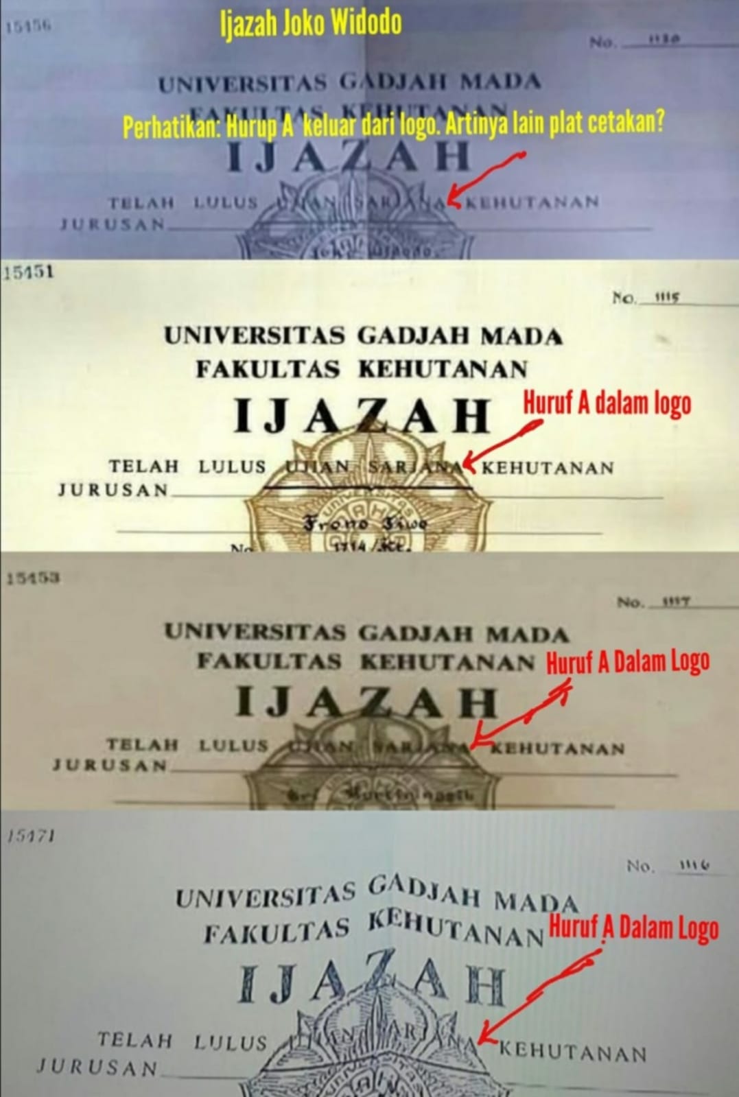 Keempat, ungkap Roy Suryo, secara detail ketiga ijazah pembanding ini adalah Nomor 1115 (atas nama Frono Jiwo), Nomor 1116 (Alm Hari Mulyono) dan Nomor 1117 (Sri Murtiningsih). Semua ijazah itu langsung diperbandingkan dengan Ijazah Nomor 1120 yang sudah diketahui bersama dinyatakan sebagai ijazah milik Jokowi. Perbandingan yang dilakukan adalah melihat bagaimana posisi logo UGM dengan tulisan yang tercetak dalam masing-masing ijazah yang diperbandingkan (terutama huruf Z pada tulisan “IJAZAH” dan huruf A-terakhir pada tulisan “SARJANA”)