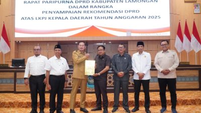 INDOSatu.co – LAMONGAN – Rapat Paripurna DPRD Kabupaten Lamongan dalam rangka penyampaian rekomendasi atas Laporan Keterangan Pertanggungjawaban (LKPJ) Kepala Daerah Tahun Anggaran 2025 dilaksanakan di Ruang Rapat Paripurna DPRD Lamongan, Senin (27/4).