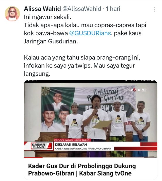 “Ini ngawur sekali. Tidak apa-apa kalau mau copras-capres, tapi kok bawa-bawa @GUSDURians, pake kaus Jaringan Gusdurian,” tulis Alissa melalui postingan X miliknya, Ahad (3/12).