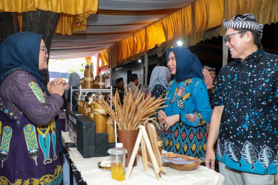 KENALKAN POTENSI: Pj. Bupati Bojonegoro Adriyanto dan istri meninjau stand UMKM Bojonegoro yang ikut Pagelaran Seni Budaya, Promosi Pariwisata dan Ekonomi Kreatif di Anjungan Jawa Timur, Taman Mini Indonesia Indah (TMII), Jakarta, Ahad (8/9).