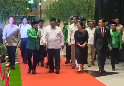 Saat memasuki area Harlah, para petinggi negara, yakni Prabowo dan Gibran tampak berjalan beriringan bersama Ketua DPR RI Puan Maharani. Di sisi kanan Prabowo, tampak Ketua Umum PKB Muhaimin Iskandar atau Cak Imin turut mendampingi rombongan memasuki aula utama JCC.