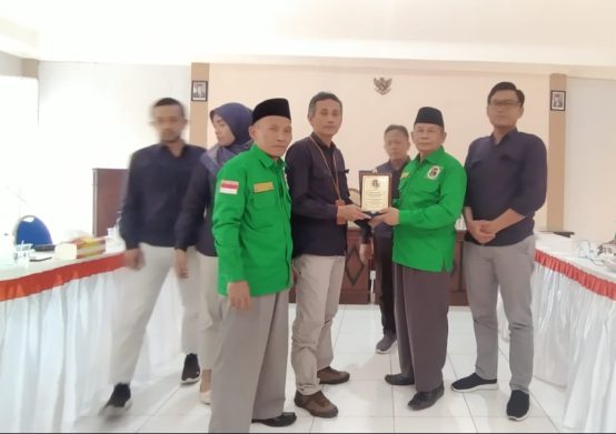 BERBAGI CINDERAMATA: Ketua DPC PPP Bojonegoro, Sunaryo Abumain (dua dari kanan) menyerahkan cinderamata lambang PPP kepada Ketua KPU Bojonegoro, Fatkhur Rohman di kantor KPU Jalan KH R. Moh. Rosyid, Desa Pacul, Kecamatan Bojonegoro Kota, Selasa (2/8).