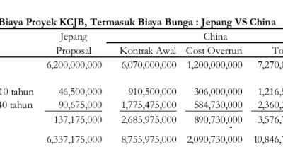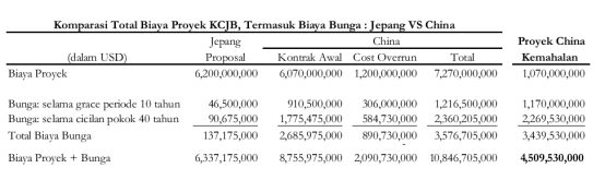 Dengan profil proyek seperti di atas, akhirnya China dimenangkan, meskipun secara total, termasuk biaya bunga, biaya proyek China ini jauh lebih mahal dari Jepang. Lihat tabel: