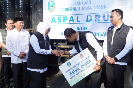 Tidak hanya itu, Khofifah juga menyerahkan bantuan program pembinaan jalan kabupaten berupa 300 drum aspal. “Jadi, kita sering mendapat laporan jalan rusak, apalagi karena musim hujan. Ini sistemnya kita sharing Pak Bupati. Pemprov bahannya, sedangkan kabupaten bagian tenaganya. Terima kasih, semoga semuanya ini dapat memberi manfaat,” ungkap Khofifah.