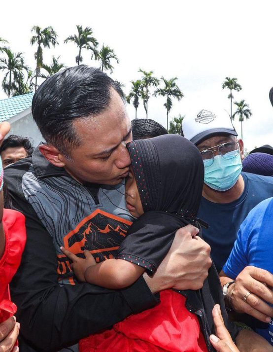 PENUH KASIH SAYANG: Ketua Umum DPP Partai Demokrat, Agus Harimurti Yudhoyono tak kuasa menahan tangis saat menggendong bocah perempuan yang menjadi yatim piatu pasca bencana alam di Pasaman Barat, Sumatera Barat belum lama ini.