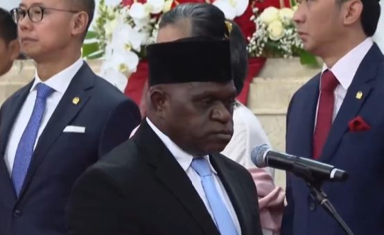 MILIKI RENCANA BESAR: Natalius Pigai saat dilantik Presiden Prabowo Subianto sebagai menteri HAM bersama 47 menteri dan setingkat menteri dalam Kabinet Merah Putih di Istana Negara, pada Senin (21/10).