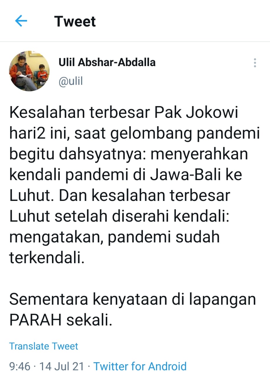 “Kesalahan terbesar Pak Jokowi hari-hari ini, saat gelombang pandemi begitu dahsyatnya: menyerahkan kendali pandemi di Jawa-Bali ke Luhut,” cuitnya melalui akun Twitter @Ulil pada Rabu, 14 Juli 2021.