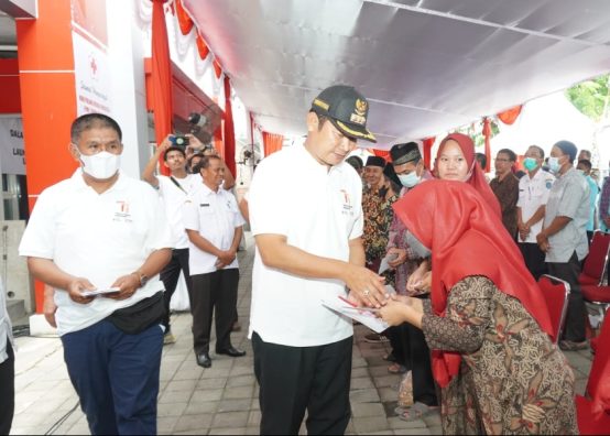 AKSI KEMANUSIAAN: Bupati Lamongan Yuhronur Efendi (bertopi) memberi tali asih kepada orang-orang yang berjasa terhadap kemajuan PMI Lamongan. dalam melayani keberlangsungan dan ketersediaan darah bagi warga yang membutuhkan.