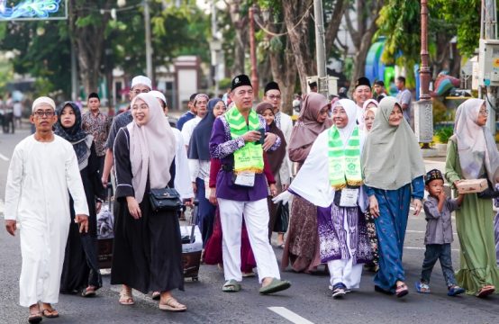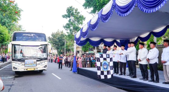 INDOSatu.co – LAMONGAN – Bupati Lamongan Yuhronur Efendi memberangkatkan jamaah haji Kabupaten Lamongan tahun 1446 H di depan Pendopo Lokatantra, Senin (19/5). Jemaah haji yang diberangkatkan menuju Asrama Haji Surabaya tersebut merupakan kloter 61 dan 62.