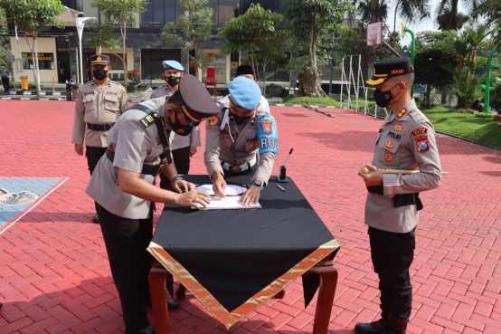 JAGA AMANAT: Kapolres Batu, AKBP Oskar Syamsuddin (kanan) menyaksikan Kasat Intelkam Polres Batu menandatangani nota serah terima jabatan (sertijab) di halaman Polresta Batu, Rabu (16/11).
