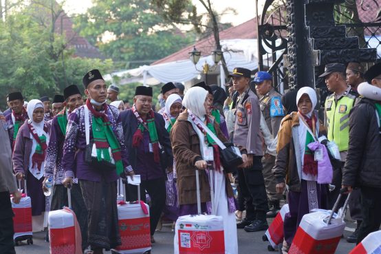 Selesai menyampaikan sambutan, bersama Forkopimda, Kepala Kemenag Kab. Bojonegoro, dan Sekda Bojonegoro serta disaksikan keluarga CJH, Pj. Bupati Adriyanto memberangkatkan rombongan CJH di Jl. P. Mas Tumapel, Bojonegoro. (*)