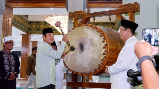 DISAMBUT SUKA CITA: Bupati Lamongan, Yuhronur Efendi (kiri) memukul bedug menandai datangnya Idul Fitri 1444 Hijriah yang dirangkai dengan acara Takbir Bersama di halaman Masjid Agung Lamongan, Jumat (21/4).