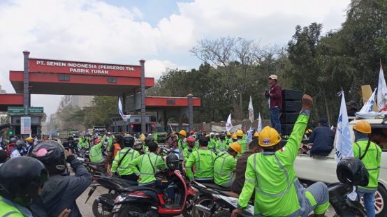 INDOSatu.co – TUBAN – Ratusan massa yang tergabung dalam Federasi Serikat Pekerja Metal Indonesia (FSPMI) menggelar aksi demo di depan pintu masuk PT Semen Indonesia Group (SIG) Tuban pukul 09.00, Kamis (8/8) pagi.