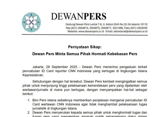 INDOSatu.co – JAKARTA – Persatuan Wartawan Indonesia (PWI) Pusat menyampaikan keprihatinan atas pencabutan kartu liputan Istana yang dialami Diana Valencia, wartawan CNN Indonesia usai melontarkan pertanyaan mengenai program Makan Bergizi Gratis (MBG) kepada Presiden Prabowo Subianto, Sabtu (27/9).