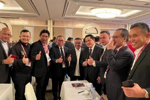 JEMPOL KEMENANGAN: Menteri BUMN, Erick Thohir (empat dari kanan) usai terpilih menjadi Ketua Umum PSSI periode 2023-2027 yang berlangsung di Hotel di Hotel Shangri La, Jakarta, Kamis (16/2).